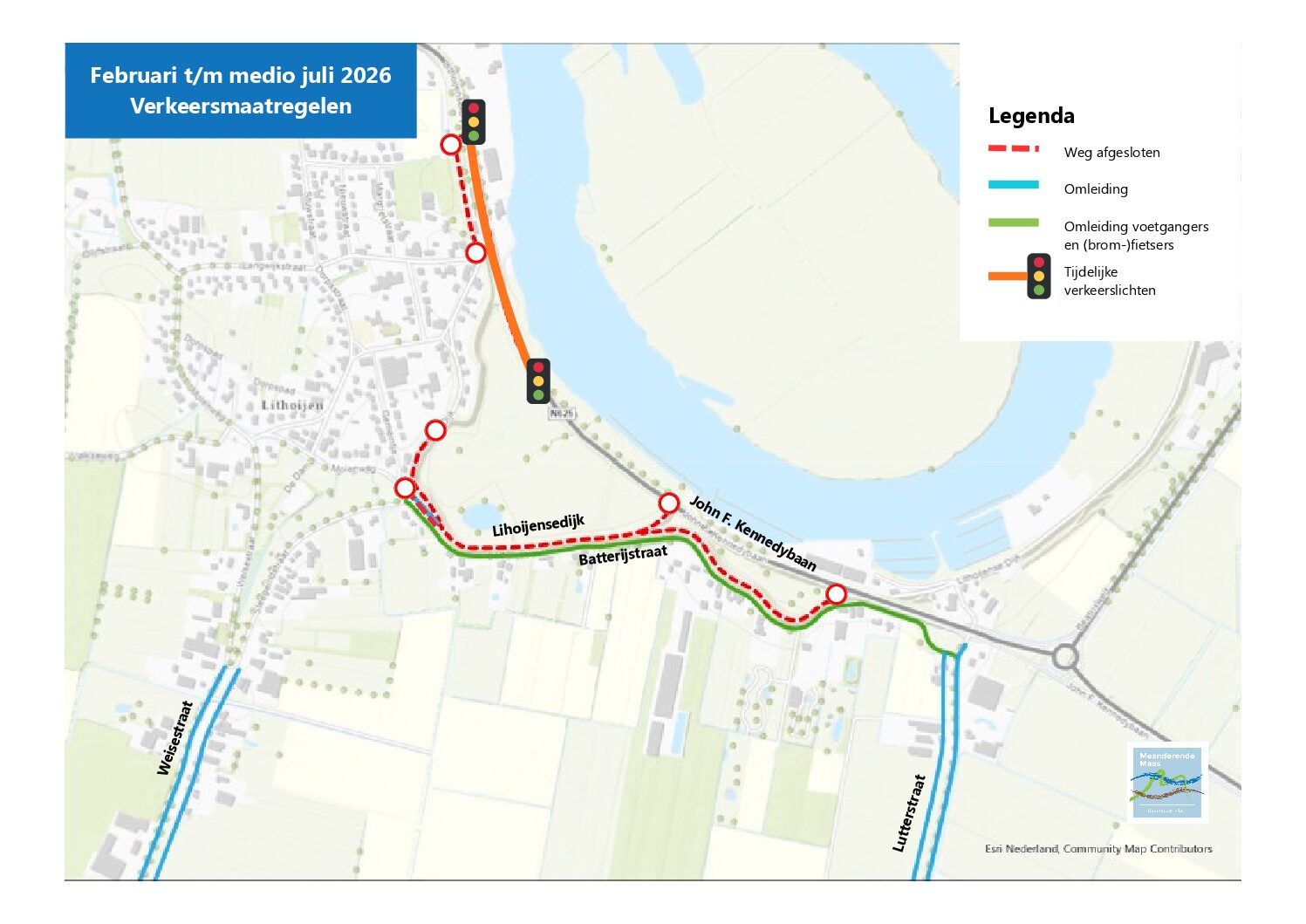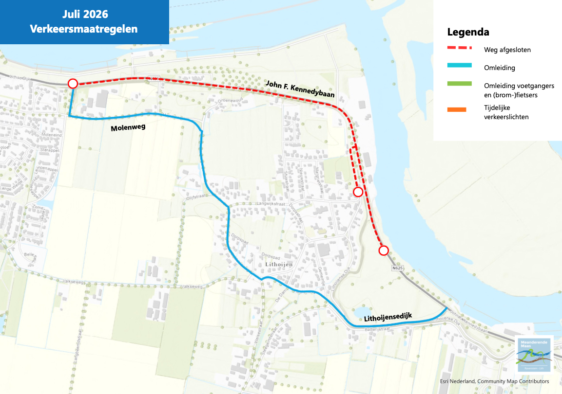 De Lithoijensedijk ten zuiden van Lithoijen, parallel aan de Batterijstraat, gaat begin juli 2026 weer open voor verkeer. Zo blijft Lithoijen bereikbaar tijdens voorgenoemde afsluiting.